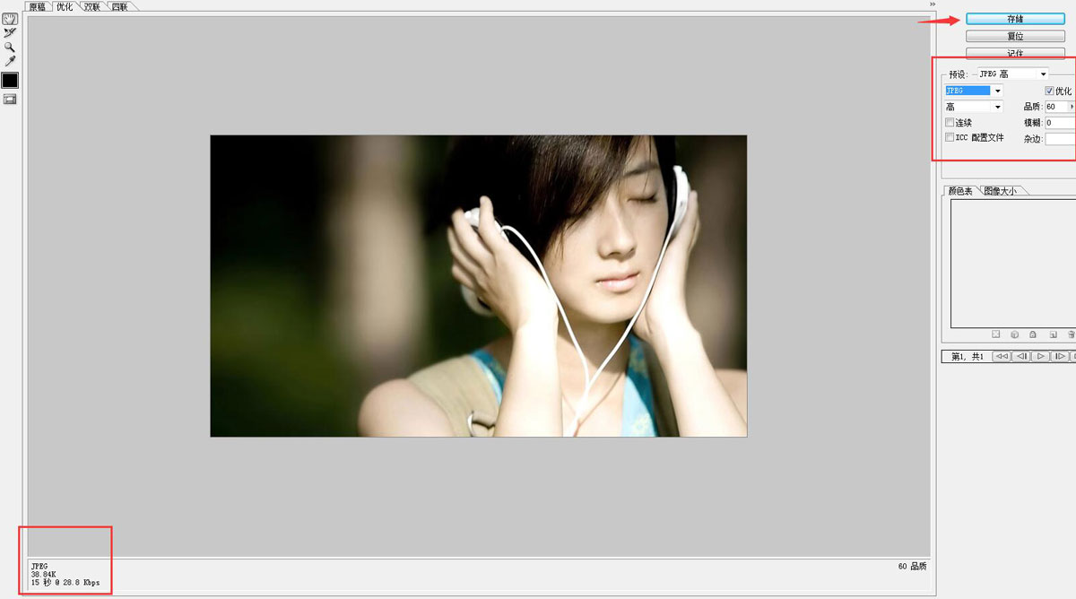 第三步:在弹出的界面中右侧,选择图片格式为jpg,质量为高!这时候我们可以看到图片大小只有38.84kb了,点击存储,保存到您电脑上,然后上传就完全在网站上使用了!